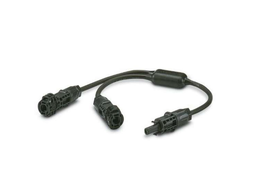 Photovoltaik-Y-Verteiler, Nennstrom: 35 A, Farbe: schwarz. Konfektioniert mit SUNCLIX – 1x Stift (minus) – 2x Buchse (plus); Länge des Einzelkabels 0,12 m