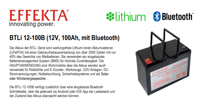 Das Monitoring der Lithium Batterie kann durch Bluetooth mit einer Smartphone App erfolgen.