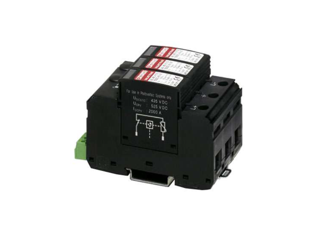 Blitzstrom- / Überspannungsableiter für 2-polige isolierte Gleichspannungssysteme 1000 V DC, für Tragschienenmontage, 3-poliges Basiselement mit Fernmeldekontakt, drei steckbare temperaturüberwachte Schutzelemente, Statusmeldung an jedem Stecker.